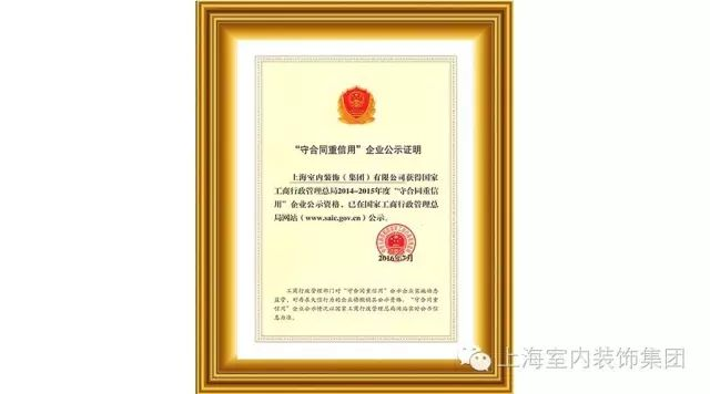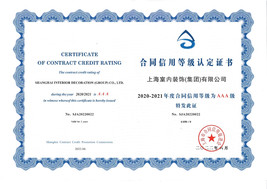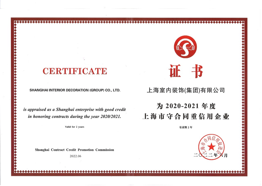 日前,室装集团再度获得2020-2021年度上海市“守合同重信用”企业荣誉称号和合同信用等级3A级的认定。这是室装集团自2008-2009年度以来第七次蝉联此项荣誉。不仅如此,公司更是国家工商行政总局颁发的“2014-2015年度守合同重信用”企业公示资格获得者,这是企业在恪守商誉、诚信经营方面得到的最高荣誉。